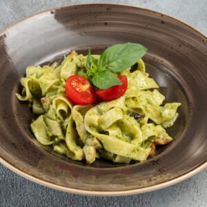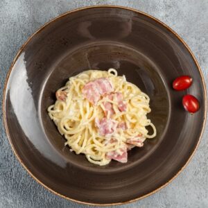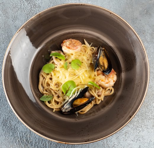 Спагетти, осьминожки, кальмары, креветки тигровые, мидии, чеснок, помидоры, оливковое масло, сливки, специи. 360гр.